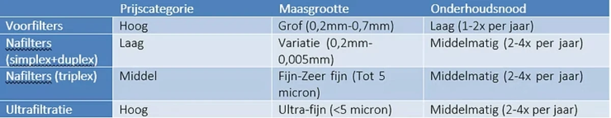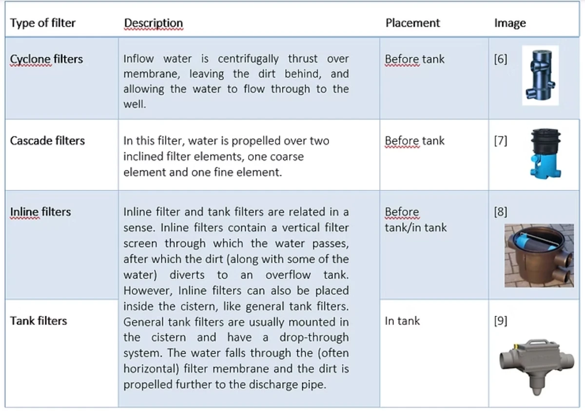 Vlario (kenniscentrum regen- en afvalwater Vlaanderen) beschrijft de 4 verschillende soorten voorfilters: Cycloonfilters, Cascadefilters, Inline- filters, tankfilters en tankfilters met een doorvalsysteem [4]. Voor elk projectzijn er dus zeker oplossingen op maat mogelijk. We overlopen ze in de onderstaande tabel.